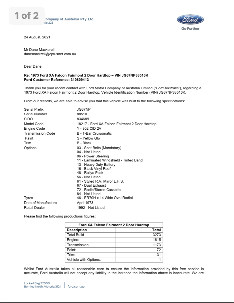 | Dealer order date: 3 Sep 1973 Final Assembly date: 22 Oct 1973 Wholesale date: 1 Nov 1973 Retail date: 17 Dec 1973  |