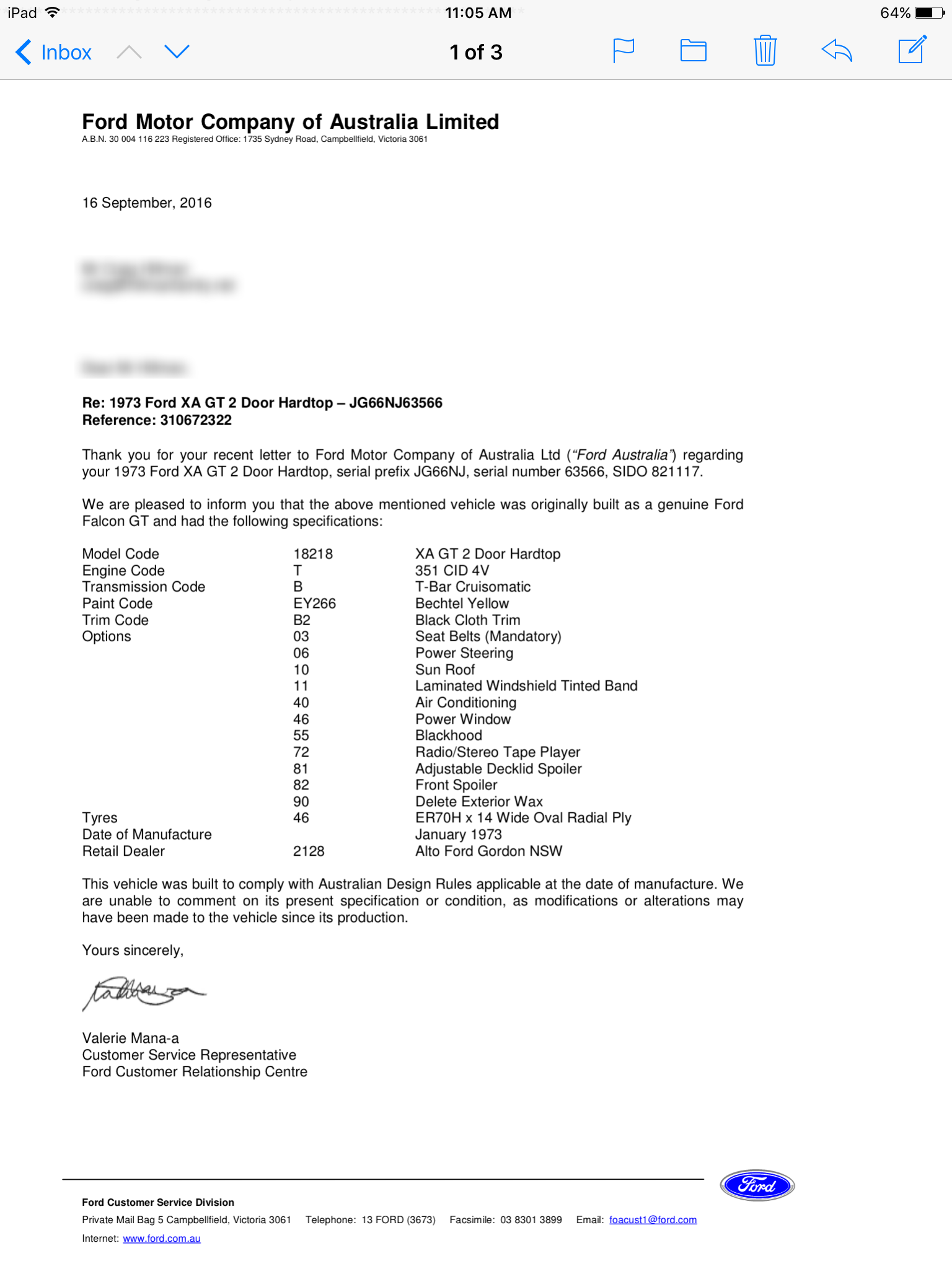 | Factory Options: | 03 - Seat Belts (mandatory) 06 - Power Steering 10 - Sunroof 11 - Laminated Windscreen 40 - Air Conditioning 46 - Power Windows 55 - Black Hood / Colour Keyed Tu Tone Bonnet 72 - Radio Tape Player 81 - Adjustable Deck Lid Spoiler 82 - Front Spoiler 90 - Delete Pre-delivery Wax 46 - ER70H 14 Wide Oval Radial RSW (pre 75) |