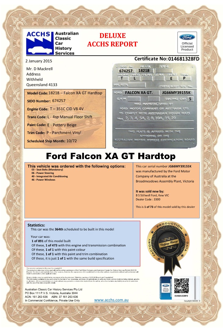 | Factory Options: | 03 - Seat Belts (mandatory) 06 - Power Steering 40 - Air Conditioning 46 - Power Windows 46 - ER70H 14 Wide Oval Radial RSW (pre 75) |