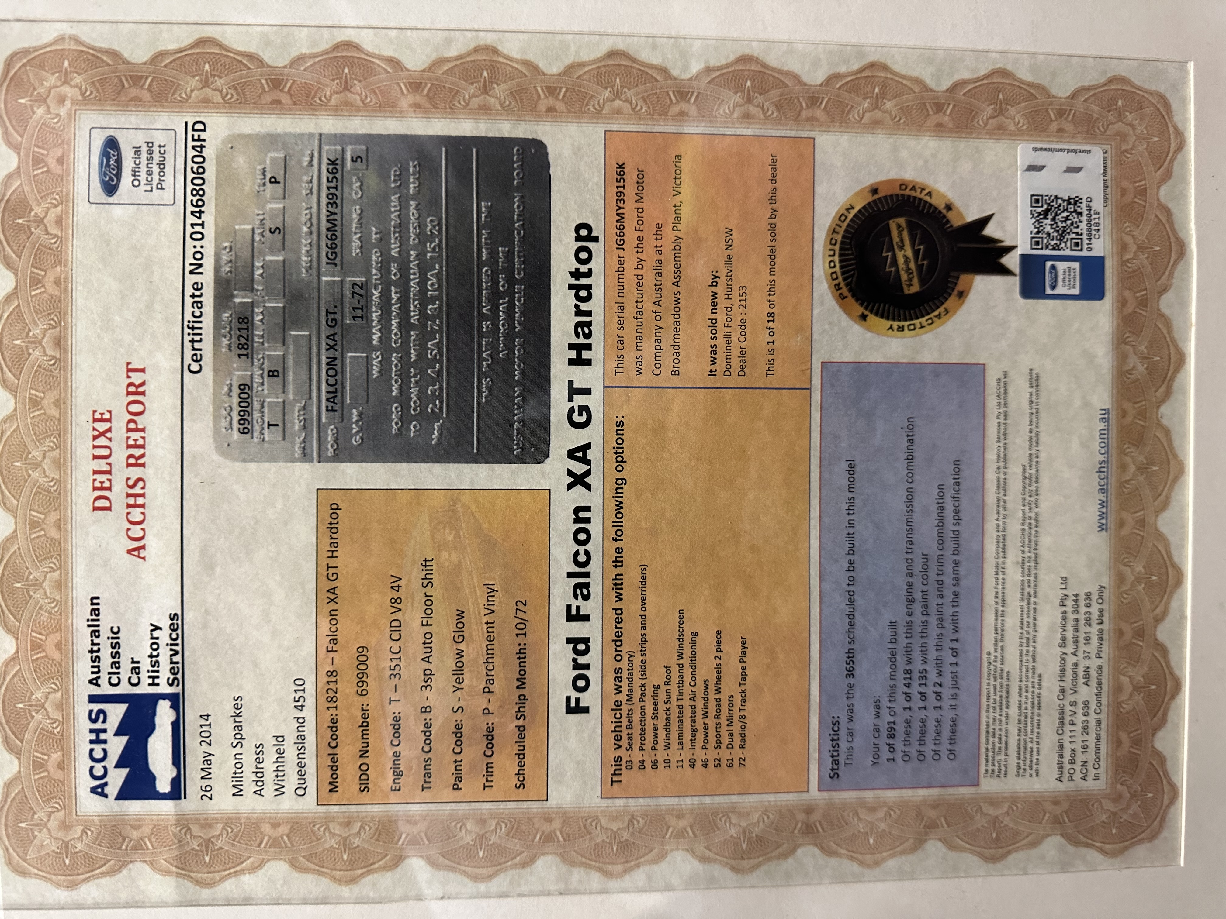 | Production Figures: | 16 - Vinyl Roof - Black 95 - Heated Backlite / Rear window demister |