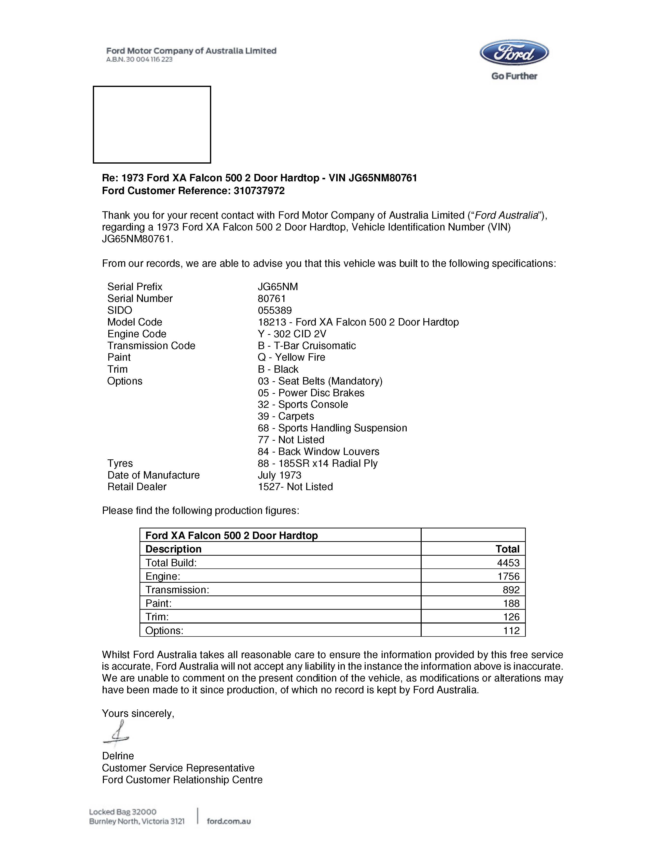 | Dealer order date: 3 Sep 1973 Final Assembly date: 22 Oct 1973 Wholesale date: 1 Nov 1973 Retail date: 17 Dec 1973 |