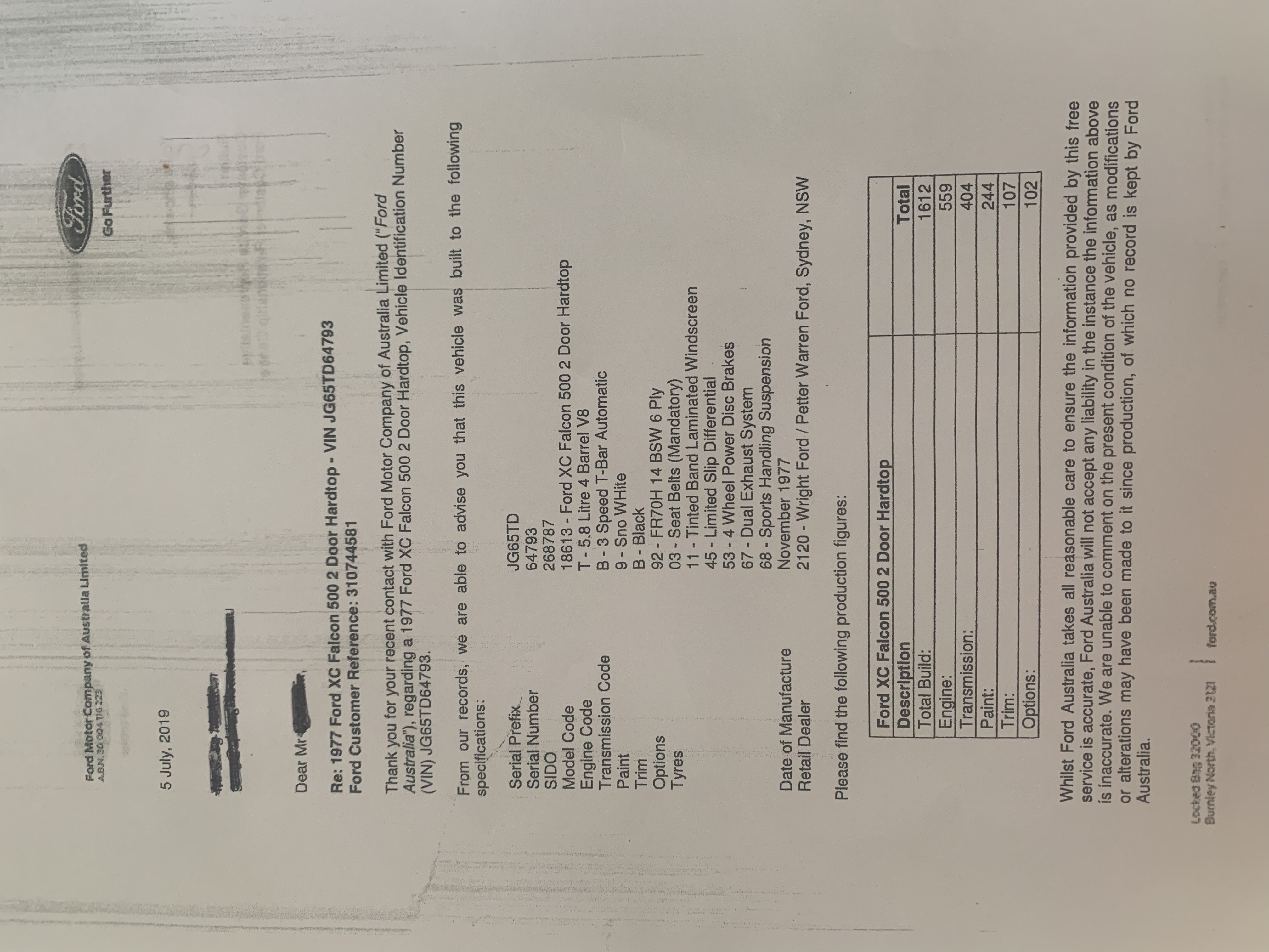 | Factory Options: | 03 - Seat Belts (mandatory) 06 - Power Steering 11 - Laminated Windscreen 40 - Air Conditioning 41 - Stereo Cassette Tape Player (XC Only) 45 - Limited Slip Diff 46 - Power Windows 53 - Four Wheel Disc Brakes (XB) 67 - Dual Exhaust (Y/K code only, Std on T code) 49 - ER70 15 Wide Oval Radial BSW (RSW 72-74) |