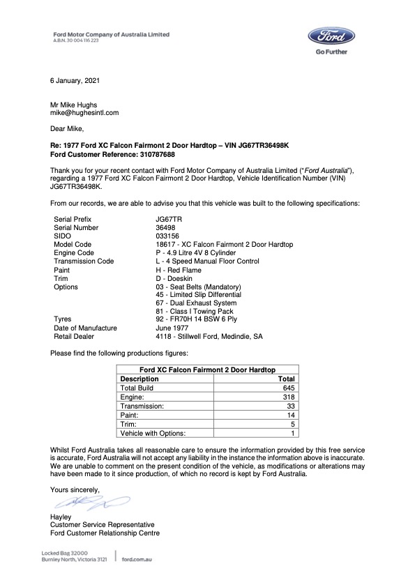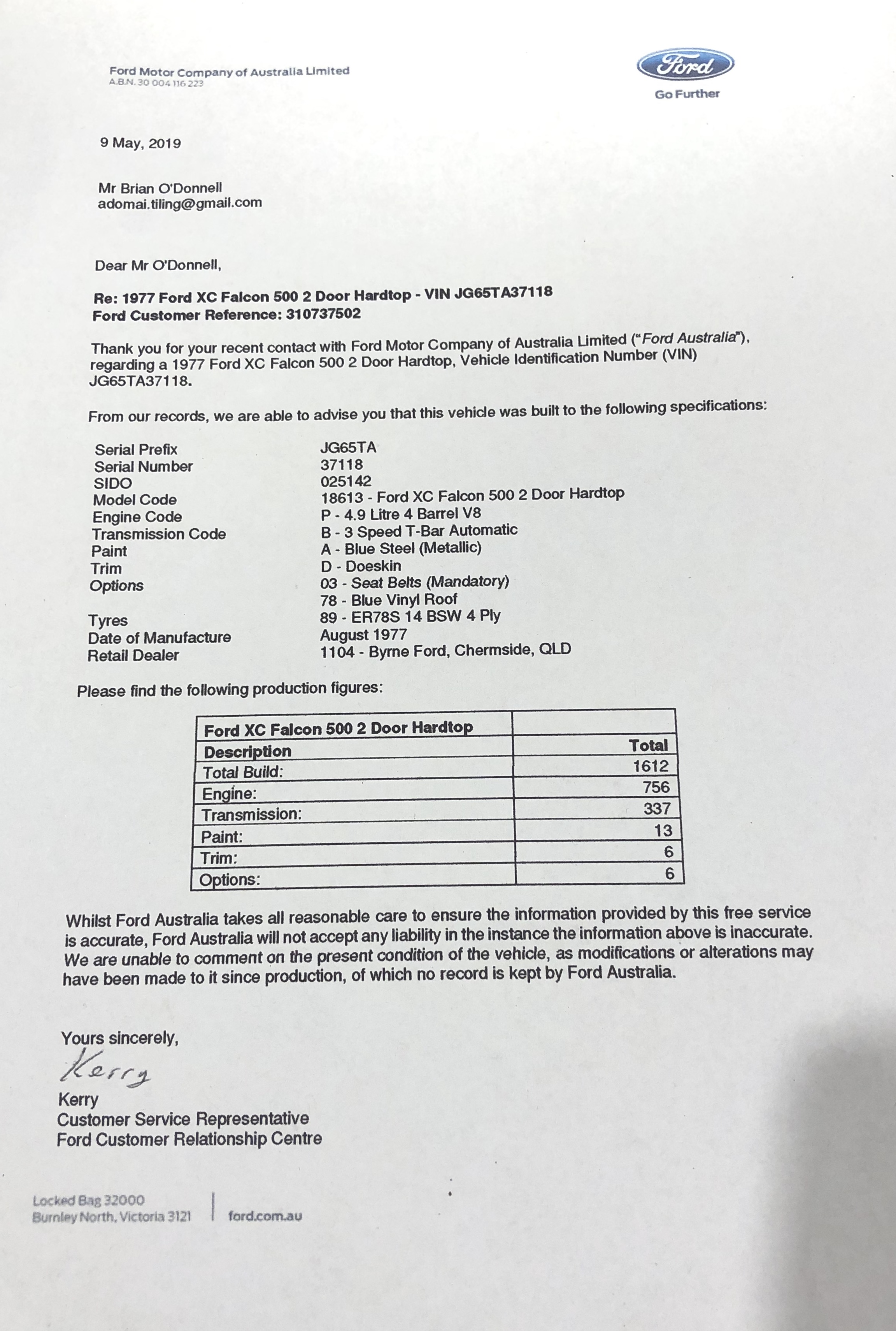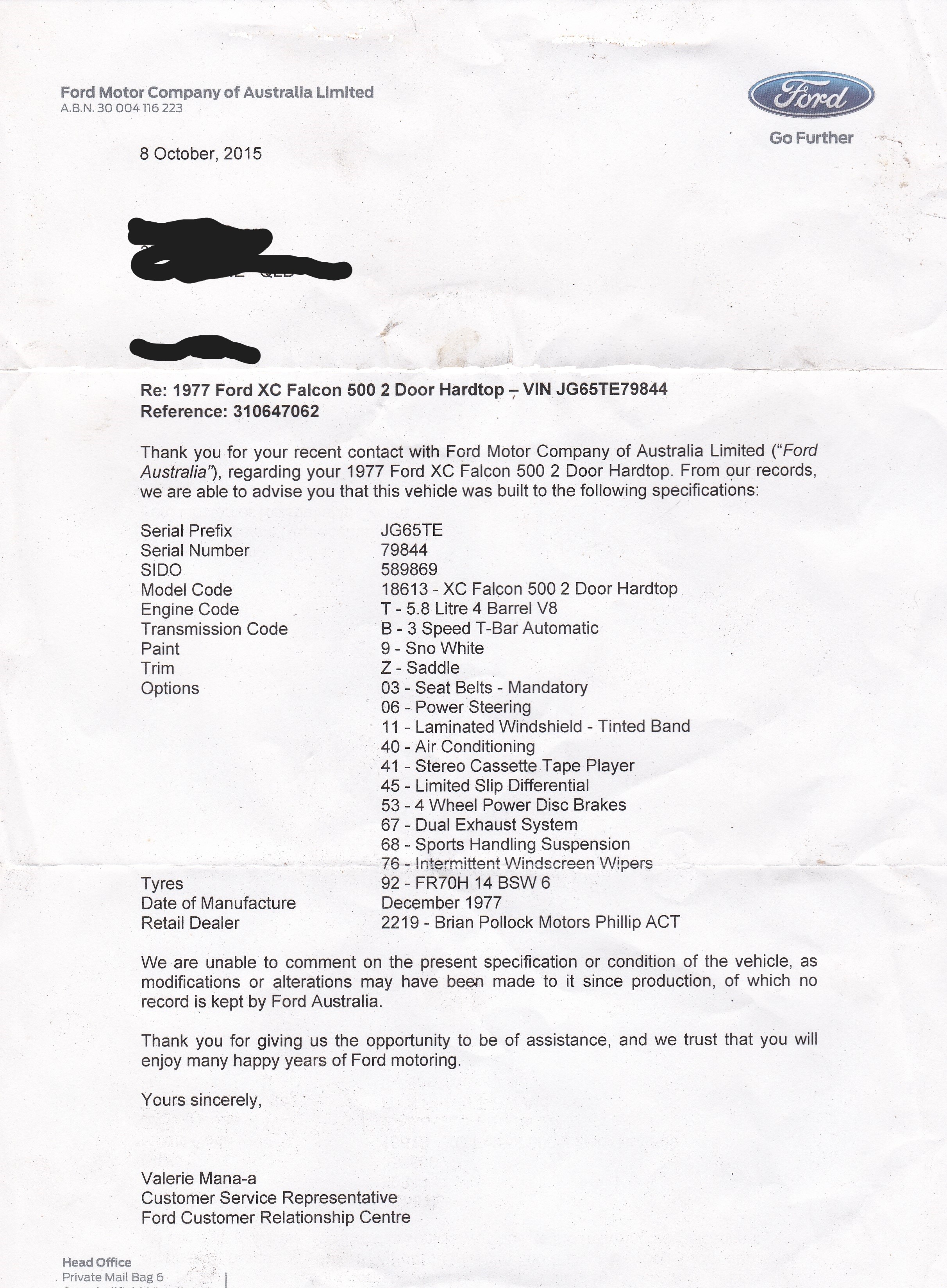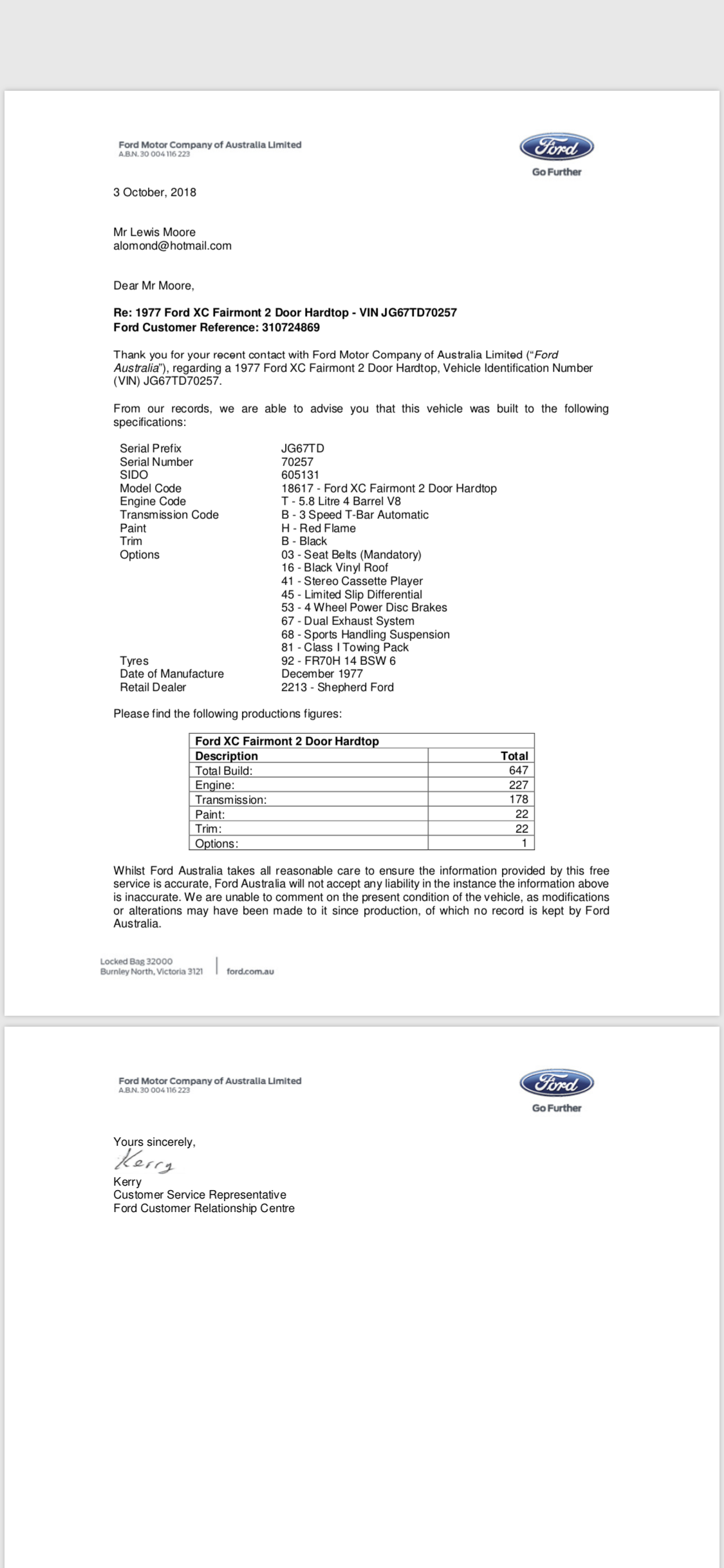 | Brought in Nov 1990 Special ordered to display at dealership, to show support for Dick Johnson (reverse paint cobra) sold in Feb 79 to first owner |