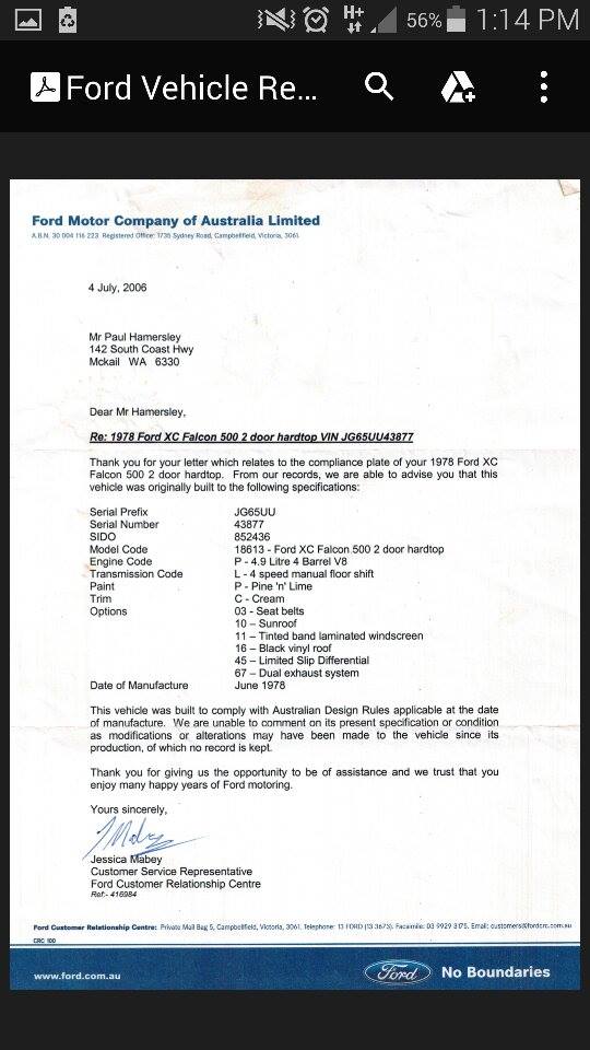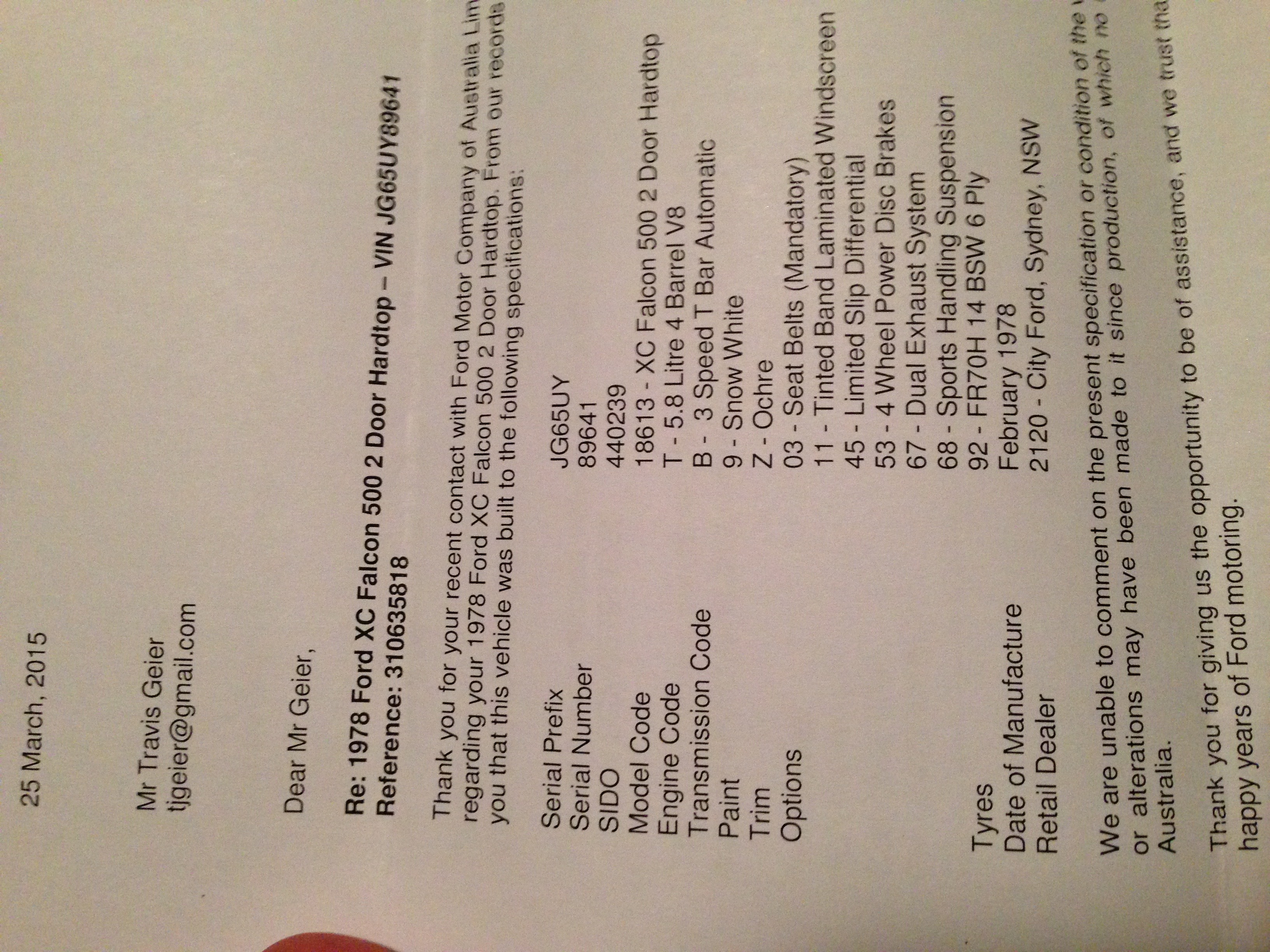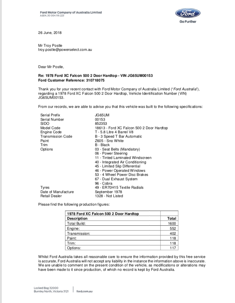 | Factory Options: | 03 - Seat Belts (mandatory) 41 - Stereo Cassette Tape Player (XC Only) 45 - Limited Slip Diff 46 - Power Windows 53 - Four Wheel Disc Brakes (XB) 67 - Dual Exhaust (Y/K code only, Std on T code) 68 - Sports Handling Suspension (V8 only) 87 - Tinted Side & Rear Windows 92 - FR70H 14 BSW 6 Ply Tyres |