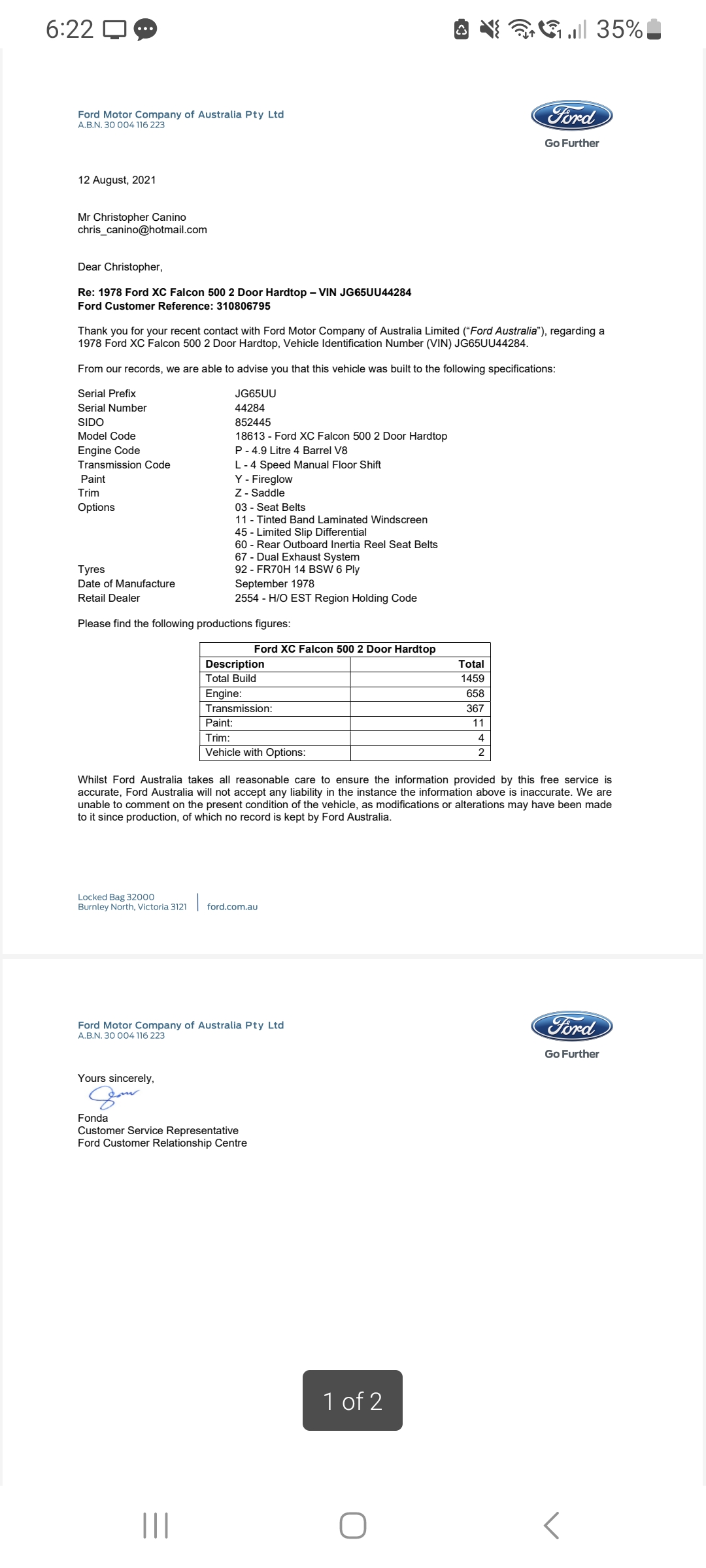 | I purchased the car in July 2024 off good friends of ours who had owned the car since 1990. The car has travelled a genuine 73,000kms and was on the cover of Unique Cars Magazine #375, also featured in Ford Fans and Ford Mania magazines and was used by Phase Three Posters for their well know Cobra poster. Car is fully factory authentic. | |||
