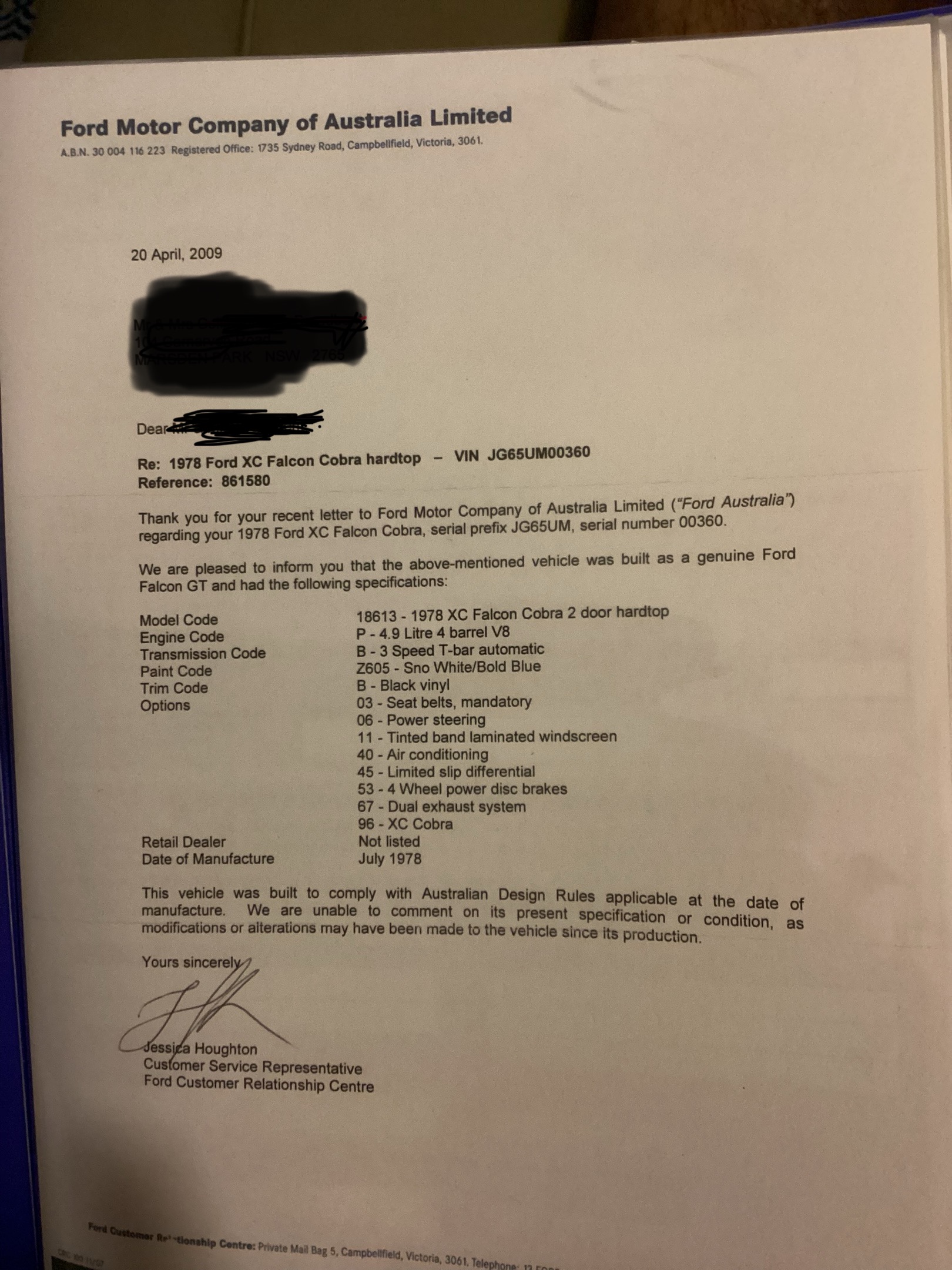 | Brought in Nov 1990 Special ordered to display at dealership, to show support for Dick Johnson (reverse paint cobra) sold in Feb 79 to first owner |